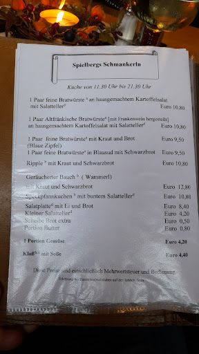 Das Weinhaus zum Spielberg ist ein schönes Lokal, mit gutem und vor allem aufmerksamen Servicepersonal. Das Essen ist gut, aber auch nichts besonderes. Es wird typische fränkische Küche serviert.