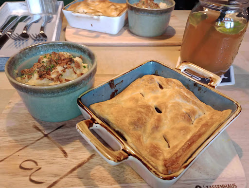 Wir waren zunächst ein wenig besorgt, weil der Pie in der Schale so flach aussah. Doch nachdem man den Blätterteig gelüpft hat, wurde man ganz schön satt. Das Kartoffelpüree und die braune Soße waren göttlich, cremig und mit kleinen Stücken. Das Fleisch war nicht, wie in Schottland, zartes Gulaschfleisch, sondern Filetstreifen.