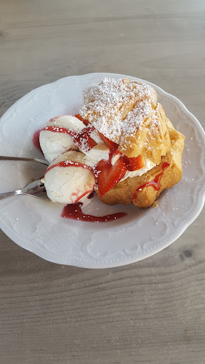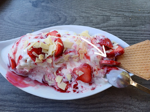 Read moreWir waren das zweite und wohl auch erstx das letzte Mal da. Unfassbar voll von draußen, drinnen kann man aber gut sitzen. Der Service ist süß und freundlich, dieses Mal war sie jedoch sehr zerstreut. Wir hatten Apfelkuchen und Spagettieis mit Erdbeeren. Der Kuchen war ok, mehr aber auch nicht, das Eis... sieh' selbst. Im großen und ganzen waren das vielleicht 4 ganze Erdbeeren. Im Zuge des großen Sparens aller Gastronomien, wird offenbar gehofft, der Dumme Gast wird schon nix merken, is schließlich Sonntag und die Sonne scheint. Ich aber finde es eine Frechheit. Als wir zwei Monate zuvor da waren, wurde das noch nicht gemacht. Da überlege ich mir dreimal, ob ich 13-15€ für ein Spaghettieis mit Erdbeeren bezahlen will. Das ist eine ganz üble Manier, so den zahlenden Gast zu verhonepipeln. Die Sahne im Eis war am leckersten und ich hatte den Eindruck das Eis hat im Geschmack iwie nachgelassen. Auf dem Foto (Pfeil) sieht man die geschnippelte Erdbeere.. oder besser gesagt, die dünnen Scheibchen, die mal eine Erdbeere...