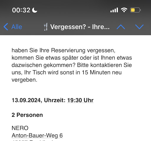 Das Sahnehäubchen dieser Enttäuschung war, als wir später zu Hause unsere Emails checkten und sahen, dass uns eine Erinnerungsmail nur eine Minute nach unserer reservierten Uhrzeit gesendet wurde. In dieser stand, dass der Tisch 15 Minuten freigehalten wird – unser Tisch wurde jedoch nach weniger als 10 Minuten anderweitig vergeben.