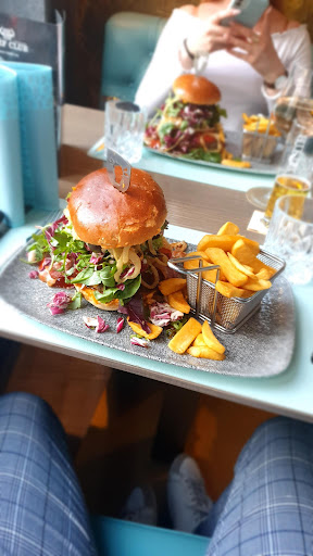 Das Interior ist bildschön eingerichtet, zwanglos, ich fühle mich auf der Bank und den Stühlen sehr wohl. Gehoben, aber nicht abgehoben eingerichtet. Stilvoll, gewagt durch das Türkis, aber perfekt abgesetzt.