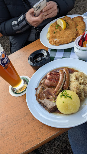 We were lucky to find a table! It was so very busy. I tried to order a table for 7pm but was told it was only possible up until 6pm. Very inconvenient when you want to eat and walk all the way with kids… The service was good, fast and friendly. I had a Brotzeit which was a lot of food but only two bits of bread weren’t enough for all the meat and sausage it came with. The kids meals were sufficient BUT I find it surprising and rude to charge for a sachet of ketchup (without even being informed about it before).
