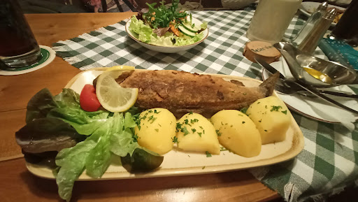 Ich muss kurz erwähnen das mein Herzmann aus Düsseldorf ist, demnach ist Ihm die bayrische Wirtshauskultur nicht wirklich bekannt. Und dazu kommt, wir haben erst seit kurzer Zeit, die Möglichkeit solche Besuche in tollen Stuben/Restaurants/Wirtshäuser etc. zu machen, er war hin und weg!! Die Stube ist superschön, urig und die Atmosphäre war richtig angenehm. Genau so wie man sich das so in einem Wirtshaus das gut besucht ist, nur vorstellen kann. Als wir uns setzten, haben wir unsere Getränke bestellt und haben uns in der Karte ziemlich schnell entscheiden können. Der Tisch war sauber, das Besteck und Servietten waren in einem Krug zur Selbstbedienung. Die Karte an sich war übersichtlich gestaltet aber es war für jeden etwas dabei. Das find ich persönlich immer toll wenn nicht 30 Gerichte zur Auswahl stehen da ich dann immer a bissal skeptisch bin, das alles immer frisch vorhanden sein soll. Nach 15 Minuten wurde die Bestellung aufgenommen und ich habe mich für eine Leberknödelsuppe und einen Schweinebraten mit Knödel entschieden. Da ich das Sauerkraut ned so gern mag hab, ich mich für einen zweiten Knödel im Austausch entschieden. Das war überhaupt kein Problem! Der Herzmann hatte eine Forelle Müllerin Art mit Beilagensalat und Butter. Nach kurzer Zeit kam dann auch schon die Suppe die mir dampfend überreicht wurde. Mei, was soll ich groß dazu sagen außer das sie perfekt war. Die Brühe war klar, a paar Fettaugen die es ja kaum noch gibt und schön würzig. Ich hab keinerlei an Salz nachgeben müssen was ich manchmal, wo anders, schon hab machen müssen. Der Leberknödel an sich aussen fluffig innen stichfest. Danach kam dann auch schon der Hauptgang. Die Wartezeiten zwischen den Gängen war wirklich gering für das große Aufkommen in der Stube und im Biergarten! Die Forelle schmeckte hervorragend und hatte einen wahnsinnig guten Eigengeschmack. Die Kartoffeln waren genau richtig und die Butter dazu war ein Gedicht. Da hat er richtig geschlemmt. Der Salat war geschmacklich gut und er wurde auch nicht im Dressing ertrunken. Mein Schweiners war der absolute Knaller! Das Fleisch war zart und war richtig so wie ich es von meiner Oma in Erinnerung hatte. Überhaupt nicht fett sondern hald wirklich eine gute und große Portion Fleisch. Als "Zuckal" gab es sogar ein Stück Schwarte die ich genüsslich mit den Fingern gegessen hab. Die Soße war ein Traum und keine Sicht von Packal oder wässrigem Saft. Die Knödel waren super und genau so wie ein Reiberknödel sein sollte. Die Portionen waren wirklich riesig und ich war am kämpfen. Am Ende war ich traurig das ich meinen Esslöffel mit der leeren Suppenschüssel mitgegeben hatte weil die hätt ich noch aufgelöffelt. ☺