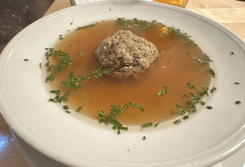 Am Freitagabend ließ ich mir die Leberknödelsuppe als Vorspeise schmecken, bei der alles gepasst hat. Der kräftigen Bouillon hat es an nichts gefehlt und der Knödel präsentierte sich locker, luftig und perfekt gewürzt. Zum Hauptgericht habe ich ein zartes Schweinsherz vom Rost genossen, das fehlerfrei zubereitet und abgeschmeckt war. Auch die Bratkartoffeln wurden vorbildlich mit Kümmel zubereitet, allerdings waren sie mir zu ungleich geschnitten und gebräunt. Außerdem habe ich Zwiebeln und Speck vermisst, aber das ist Geschmacksache.