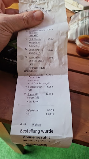 Die lange Lieferzeit wurde mit der Qualität und den vielen Bestellungen gerechtfertigt. Das Essen war jedoch bei Ankunft kalt. Die Burger haben ganz gut geschmeckt, jedoch war das Fleisch trocken und die Pommes sehr stark gewürzt.