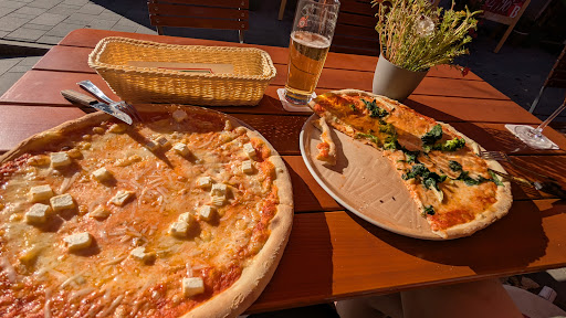 Okay fangen wir mal an; Draußen auf der Straße steht ein Schild "Di-Fr Pizza o. Pasta mit Salat 8,90€", okay kann man mal eine Chance geben. Dass das aber nur Mittagsangebot ist erfährt man nur auf Nachfrage oder durch ein unscheinbares Schild im Hof (vor den Werbetafel lol). Klassischer Bauerfang. Gut wird halt der normale Preis ohne Salat bezahlt. Zwei Pizzen bestellt (quattro formaggi und veg. Spezial). Im Hinterkopf behalten 14 und 13€ die Pizzen. Bekommen die veg. Spezial und eine Spezial mit Fleisch. Passiert, ging zurück. Ich habe dann von der vegetarischen Spezial probiert und bin schnell zur Bedienung und wollte meine Pizza stornieren. Ging leider nicht mehr. Die veg Spezial war furchtbar; Teig absolut geschmackslos langweilig und weich. Brokkoli und Spinat TK. Pizza war durchnässt durch das TK Gemüse. Also hat man Suppe auf Teig.