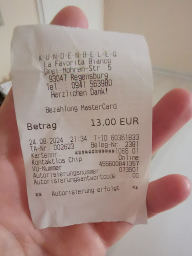 Read moreWährend unseres 4 tägigen Urlaubs in Regensburg erwies sich dieses Restaurant als das einzige Negativerlebnis. Wir kamen gut gekleidet dort gegen 18:00 Uhr an und wollten vor dem Theater um 19:30 noch etwas essen und trinken. Das Restaurant war noch nahezu leer, dennoch waren fast alle Plätze reserviert. Wir bekamen dann den letzten Katzentisch vor dem Durchgang zur Küche.