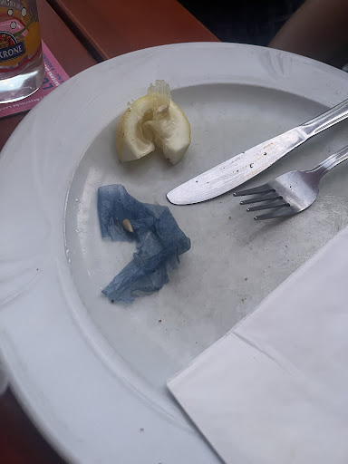 Im Salat waren alte gammlige Blätter (siehe Foto). Zwischen den Schnitzeln lag noch Abtropfpapier (siehe Foto).