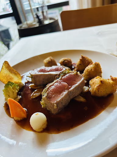 Die Speisen lesen sich sehr gut, leider sind sie es geschmacklich nicht. Schweinerückensteak mit Champignonrahmsoße - Anrichtung naja, das Steak war in Soße ertränkt, nichts für Fleischliebhaber. Geschmacklich recht süß, fast schon klebrig im Mundgefühl, keine Komponenten rausgearbeitet. Das Fleisch war gut, zart, geschmacklich bestimmt auch, aber wie gesagt in süßer Soße ertränkt, alles in allem wenig würzig. Vlt. die Äpfel weglassen oder eine andere Sorte und weniger. Kroketten selbstgemacht, waren okay, etwas klebrig (Stärke nicht abgenommen?) und nicht knusprig. Leider aus meiner Sicht einfaches Landgasthausniveau.