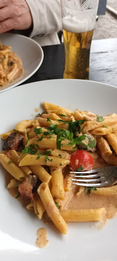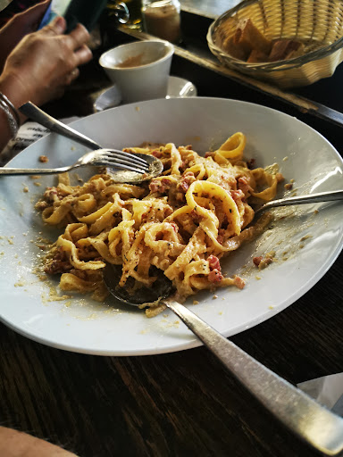 Das Personal ist freundlich und höflich, was besonders beim Abräumservice auffällt, der regelmäßig aufräumt und zuvor immer fragt, ob und was schon weggeräumt werden kann. Bei dieser Gelegenheit wird auch gelegentlich gefragt ob alles okay ist/war; dies dürfte aber für meinen Geschmack noch häufiger geschehen. Bestellungen werden im Bistro ausschließlich am Tresen getätigt und dort auch zügig bearbeitet. Die fertige Bestellung muss sich der Gast jedoch selbst abholen und zum Tisch bringen, nachdem er zuvor mit einem "Pieper" über die Fertigstellung informiert wurde. Wie zu vermuten ist, liegt der kulinarische Schwerpunkt des Lokals auf mediterranen Gerichten: Pizza und Pasta in allen Formen und Farben, aber auch vereinzelt Burger und Vergleichbares. Sehr zu empfehlen sind die direkt im Parmesanrad angerührten Spaghetti! Die Portionen haben eine angenehme Größe; sie sättigen ausreichend, ohne dass man sich leicht überfrisst. Die Gerichte sind gut zubereitet: die Pizza ist knackig und nicht überladen, die Pasta aldente und gut gewürzt und die Desserts (wie sollte es anders sein) süß und lecker. Lediglich die Salate erschienen mir zuletzt etwas sparsam und traurig. Preislich bewegen sich die Gerichte im Bereich von ca. 10€. Bei gutem Wetter verleitet die Terrasse dazu in der Nachmittagssonne zu verweilen und doch noch ein gemütliches Getränk zu genießen. Die "große" Straße, die vor dem Bistro verläuft, kann dieses Gefühl der Ruhe (kaum) stören.