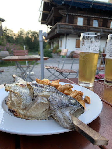 Die Speisekarte ungefähr so klein wie das Restaurant an sich. Drei Vorspeisesuppen und drei Forellengerichte mit Beilage. Die kleine Karte ließ schon erwarten, dass die Gerichte geschmacklich überzeugen werden. So war es dann auch, der Kaspressknödel in der Suppe war fluffig, der Käse schmolz etwas durch die Suppe, so wie es sein soll und die Brühe war schön kräftig. Das Forellenfilet war an diesem Abend schon aus, was uns dann dazu verleitete den Steckerlfisch und die geräucherte Forelle zu probieren. Beide Fische waren köstlich, das Fleisch war wunderbar zart, ungewürzt und ließ sich kinderleicht von den Gräten lösen. Die Beilage waren Kartoffelecken für uns, es gab auch noch Krautsalat. Die Kartoffelecken hätten für meinen Geschmack auch Bratkartoffel sein dürfen, aber lecker waren sie trotzdem.