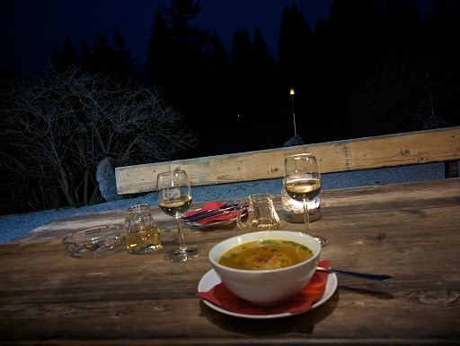 Krass! Krass! tönte es uns am Tisch von einem gerade ankommenden Gast entgegen. Nicht nur dieser Gast, sondern auch die Wirtin war sehr verdutzt, als wir fragten, ob wir auch draußen am Tisch sitzen können, es sei doch so kalt. 14°C in den späten Abendstunden und herrlich warme Winde machten das Sitzen vor der Forellenstube nicht nur auszuhalten, sondern genießbar.