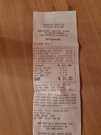 Read moreIch bin mir nicht ganz sicher. Aber das Restaurant ist nachdem man sitzt dann doch eine Bahnhofskneipe. Schnell rein und schnell raus. Ich bin noch nie aus einem Restaurant nach den Vorspeisen gegangen. Das Porto Bello in Reit im Winkl hat das geschafft. Da helfen auch die 120 Sorten Wein nicht. Die Vorspeise Bruschetta mit geschmacksneutralen Tomaten und lauwarmem Toast. Unerträglich. Dann Antipasti misti. Im Öl ersoffen und der dazugehörige Salat ohne vinaigrett. Alles mit wenig Geschmack, so das ich aus lauter verzweifelung nach Pfeffer und Salz griff. Das alles incl. Wein in 10min. Hier wird man abgefertigt. Gemütliche Stimmung um gemeinsam zu Essen... In diesem Restaurant ein Fremdwort. Nach der 2ten Vorspeise sind wir gegangen. Das Hauptgericht wollte ich dann nicht mehr. Ist vermutlich auch besser so gewesen. Wo die positiven Rezensionen herkommen ist mir leider nicht...