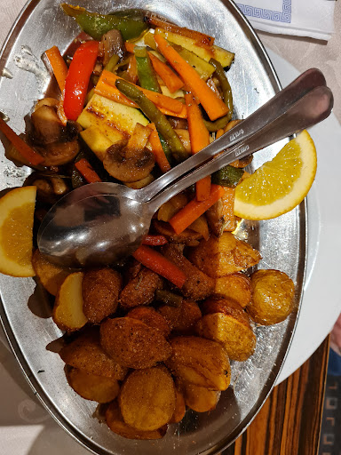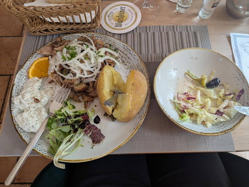 Spätes Mittagessen 15.00 Uhr, Restaurant wenig besucht, sprich - die Küche hat in der Regel etwas mehr Zeit und es sollte das Beste auf den Teller kommen. Ein nettes Ambiente und ein freundlicher Empfang, mit Erklärung der Spezialitäten des Tages frohlockte. Unsere Auswahl war: Überbackener Schafskäse, Vorspeisenteller gemischt warm/kalt, Zwiebelsuppe, Rhodos Teller Beilagensalat und ein Salat mit Putenstreifen, Wein 0,5 LTR Athos, 0,75 LTR Mineralwasser. Kosten knapp 59 Euro. Doch wenn man dann beim gemischten Vorspeisenteller (warm/kalt) schon auf den typisch griechischen TK Broccoli trifft, um dann bei den Salaten von Cocktail Sauce und Kräutern Dressing aus der Flasche umgarnt zu werden, wundert man sich am Ende auch nicht mehr, warum das Gyros trocken, teilweise schwarz verbrannt, und die Putenstreifen innen zum Teil noch roh sind. Das Ganze lediglich mit Salz und Pfeffer gewürzt und staubig langweilig daherkommend, holten auch der überbackene schmackhafte Schafskäse und die Cremes a la Aubergine, Tarama und Co. die Gesamtleistung nicht mehr nach vorne. Die griechischen Kartoffel a la TK Spalten in der Fritteuse oder auch im Tiefem Fett mit demselben angereichert und mit Salz und einem Quentchen Paprika "abgeschmeckt", bilden dann auch das traurige Ende der Reise nach Rhodos!