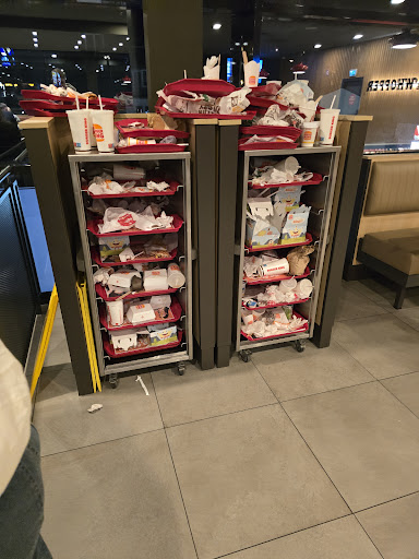 Beim warten sehe ich wie ein andere Mitarbeiter bei der Mülltonne ( stand Nähe Speise Ablage )den Beutel wechselt ohne Handschuhe, direkt danach er die neue Tüte in den müll steck, nimmt er den letzten Bürger der schon auf der warte Ablage war und geht nach hinten damit. Ich hoffe mal das er sich die Hände gewaschen hat. (Und nicht aus dem Hamburger eine cheesburger gemacht hat )