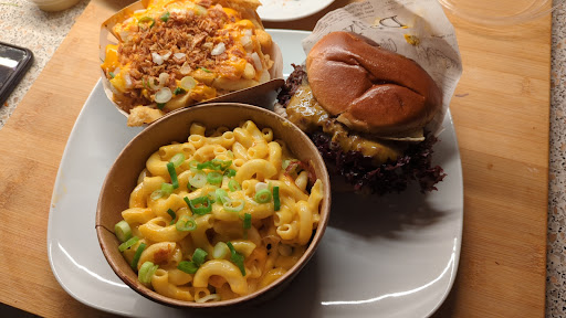 Ihr solltet alle hier essen gehen, damit uns dieses tolle Burgerlokal noch möglichst lange erhalten bleibt! :) Die Burger sind schmackhafte Eigenkreationen, auch Vegetarier und Veganer können etwas Leckeres finden. Es werden neben Burgern auch andere typisch amerikanische Gerichte angeboten, darunter auch welche, die hierzulande eher unbekannt sind. Auch sind z.B. im Caesar's Salad tatsächlich die Zutaten drin, die da wirklich reingehören. Insgesamt habe ich den Eindruck, dass hier jemand wirklich Ahnung von amerikanischer Küche hat, soweit ich das denn beurteilen kann. Von der Auswahl und dem Geschmack her schon mal große Klasse! Das alles noch zu einem guten Preis, da habe ich anderswo schon mehr bezahlt für schlechtere Burger. Die Einrichtung ist auch sehr gut gelungen, modern und trotzdem gemütlich. Ich kannte auch noch das Restaurant, das vorher hier drin war und da hatte ich oft gedacht, dass es viel zu dunkel eingerichtet ist und es dem Raum gut tun würde ihn heller zu gestalten. Das hat man hier jetzt ganz toll hinbekommen! Wir kommen auf jeden Fall wieder! :) Einiger Verbesserungsvorschlag: Richtiges Geschirr und Besteck statt Pappschiffchen würde noch mehr hermachen, würde Müll sparen und man hätte auch mehr Platz auf dem Teller. Das wäre insgesamt noch eine...