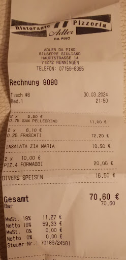 Read moreZuerst hatten wir uns über die Preise der Pizzas gefreut, die servierte Größe hat diese Freude dann wieder deutlich relativiert; sagen wir mal so: eher übersichtlich. Aber zum Preis hin gesehen: noch i.O. Geschmacklich waren die Pizzen sehr gut (Salami + Thunfisch-Zwiebel) Zu den Getränken: ich hatte die Wahl zwischen einem 0.5l-Pils für 3,60€ und einem 0,3l-Pils für 3,10€ (Preise aus der Speisekarte). Habe aufgrund akuter Unterhopfung das große (0,5l) bestellt und eine eichstrichgenau eingeschenkte 0,4l-Pilstulpe bekommen. Abgerechnet wurden natürlich 3,60€. Hmmmm. Kartenzahlung ist aktuell nicht möglich (laut Aushang), nebenan sitzende Gäste meinten, dass dss "aktuell" doch eher schon ein "schon lang nicht mehr" sei. Dazu kann ich selbst aber nichts sagen. Als Beleg gab es dann den handgeschriebenen Bestellblockzettel ergänzt um die Preis. Der Service selbst (bis auf die Wirtin) waren allesamt betont freundliche Italiener. Das Ambiente ist eben Dorf-like, ein kleiner Hinterhof zwischen Wohnhäusern und parkenden Autos. Teilweise schön laubenartig überdacht, tlw. auch ganz im freien neben abgemeldeten, rostigen Fahrzeugen. Aber egal: die Pizzen, und um das geht es ja primär, waren...