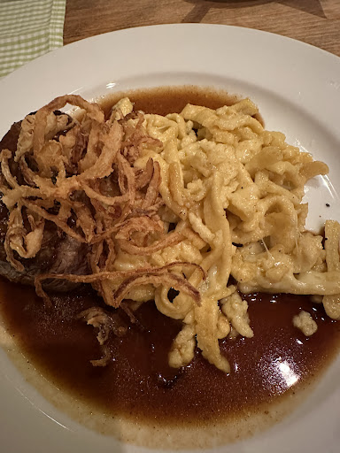 War am 26.12. 2015 dort Essen. Frau Sohn und Ich. Wir wurden sehr freundlich begrüsst. Essen hat bisl gedauert, aber ok wenns frisch sein soll isses ok.Preise sind sehr Motiviert. Schnitzel Wiener art mit Pommes 10.90 plus 3,50 Beilagensalat. Keine Soße nur 2 kleine Plastik beutel Katcheup.Fleisch war komplett ohne gewürz, sah man unter der Panade die vom Fleisch ( 2 x Nackensteak ) gefallen ist. Ich hatte einen Schwäbischen Rostbraten plus Beilagensalat ca 20 Euro !!!!!!!!!!!!! Ein sehr kleines Steak ( geschätzt 150 gramm ) das den Garpunkt hatte den ich wollte. Käsespätzle , kleine Hand voll und paar Mehlierte harte Zwiebel. Soße fehlanzeige. Auch mein Fleisch war sehr wenig gewürzt nur mit Pfeffer, Gewürz zum nachwürzen gab es nicht auf dem Tisch.Meine Frau hatte Angus Steak ( etwas grösser als meins ) das den gewünschten Garpunkt ebenfalls hatte.Auch hier kein Gewürz ausser Pfeffer,bratkartoffeln , naja villeicht eine geschnitten, also ebenfalls mini Portion , Soße keine . Dieses knappe 17 Euro.