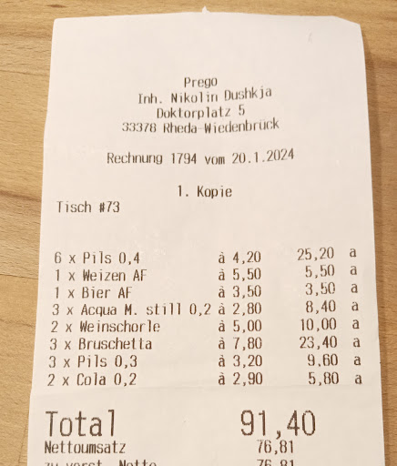 Die Aufmachung lässt etwas Gehobenes vermuten, doch das ist ein Trugschluss. Es handelt sich um eine Pizzeria und nicht mehr. Auch wenn hier offenbar "Tönnies & Co." zur Kundschaft (ist auch der Vermieter) gehören, es ist nichts Besonderes.