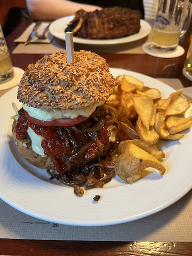 • Hauptspeise: 5/5 Als Hauptspeise habe ich mich für meinen dortigen Lieblingsburger entschieden, dem Road House-Burger mit Kartoffelchips ähnlichen Pommes. Als Extras oben drauf dazu noch Schmorzwiebeln, Bacon und Käse für insgesamt 22,50 Euro. Stolzer Preis, aber meiner Meinung nach angemessen. Ich durfte von meiner Begleitung übrigens die Spare Rips probieren, welche ich seit Jahren nicht mehr gegessen hatte und es hat sich an meiner Meinung nichts geändert: Es sind einfach die zartesten und besten Rippchen, die ich jemals gegessen habe. Super lecker!