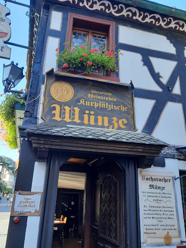 „Eigentlich“ wollen wir in der Münze an einem Mittwoch im August gegen 13.00 Uhr lediglich etwas draußen sitzen, Flammkuchen essen und Wein trinken, um dann zeitig wieder nach Hause zu reisen. Dieser Plan ging nicht auf: um 21.30 Uhr verließen wir diesen Ort gepflegter Gastlichkeit. Die Gründe dafür, dass man die Münze nur widerwillig verlässt, lassen sich nur an mehreren Händen abzählen. Dazu zählen eine mit Sachkunde getroffene Auswahl an lokalen und regionalen Weinen und Spirituosen zu mehr als fairen Preisen, der großzügig portionierte und auf die Sekunde exakt gebackene Flammkuchen, der Ausblick von der Terrasse auf den gegenüber liegenden Weinberg („Bacharacher Posten“?), die „entschleunigte“ Atmosphäre, in der man rasch mit Einheimischen und (meist als Paar hier einkehrenden) Touristen in nette Gespräche kommt, das urige Innere des historischen Gebäudes, vor allem aber der gute Geist in Küche und Service, amüsante Unterhalter, umsichtige Gastgeber und unermüdliche Auskunftgeber auf alle ihm gestellten touristisch relevanten Fragen und Bitten: Andreas, dem der Grad eines „Masters of Multitasking“ gebührt. Da bei unserer Ankunft kein Platz auf der Terrasse mehr frei war, dauerte es etwas, bis sich unsere Augen nach dem Eintreten an das Dunkel im niedrigen Innenraum mit seinen massiven herab hängenden Deckenbalken gewöhnt hatten, als uns eine Männerstimme in Englisch riet, auf unsere Köpfe aufzupassen. Auf unsere Antwort, dass man mit uns ruhig in Deutsch sprechen könne, trat ein junger Herr aus der Dunkelheit hervor, den wir spätestens drei Minuten ins Herz geschlossen hatten, weil er die Frage, ob der „Loreley Rivaner“ auch wirklich trocken sei, umgehend äußerst pragmatisch ohne große Worte beantwortete. Flugs standen zwei Gläser mit generös eingeschenkten Proben auf dem Tisch, nach deren Verkostung wir keinen Anlass mehr hatten, an der Richtigkeit der Bestellung einer Flasche dieses in der Tat trockenen leichten Sommerweines zu zweifeln. Fünf Minuten später hatten wir das Glück, dass ein Tisch auf der Terrasse frei wurde. Wieselflink hatte Andreas diesen für uns gereinigt und eingedeckt, sodass wir nun in erster Reihe den Ausblick auf das beschauliche Straßenleben und den gegenüber liegenden Weinberg genießen konnten. Wenig später tischte Andreas zwei große Flammkuchen von perfekter Konsistenz auf, die er unter Berücksichtigung geschlechtsspezifisch unterschiedlicher Essgewohnheiten in kleinere und größere Stücke schon vorgeschnitten hatte. Von so viel Liebe zum Detail angetan, kam unser Vorsatz, nach dem mittäglichen Imbiss die Münze zu verlassen, bereits ins Wanken. Da in der Münze nur Bares gilt, machte ich einen kurzen Abstecher zur VB-Filiale. Die 5,80 Euro Gebühr für eine Barabhebung wären sinnvoller in zwei weitere Gläser Wein oder Digestif oder alternativ „Krustenbrot, Käsewürfel, Weintrauben“ zu 4,90 €) investiert gewesen.Weil mittlerweile die Sonne prall auf die zuvor schattige Terrasse strahlte, entschieden wir, dass weitere Flüssigkeitszufuhr keine schlechte Idee sein könne, ohne dabei die feste Nahrungsaufnahme zu vernachlässigen. Das mündete in die Bestellung einer zweiten Flasche „Loreley“ und einer Käseplatte. Für meine Begleiterin kamen sukzessive vier lokale Riesling auf den Tisch. Da Andreas stets eine Mappe lokaler Unterkünfte griffbereit hat, konnten wir unbesorgt dazu übergehen, den Durst im weiteren Verlauf des Nachmittags statt mit Wein mit Sekt bzw. Koblenzer Weizenbier (0,5 l für 3,90 €!) zu stillen, was sich als gute Wahl erwies. Am späten Nachmittag zog es Andreas nach Hause zu seinem Nachwuchs, und an seiner Stelle übernahmen die aktuelle Besitzerin Heike und ihre Tochter Veronika das Zepter. Zweifellos sind alle drei ausgesprochen herzliche und freundliche Gastgeber an einem Ort, der in idyllischer Weise lokale Verwurzelung mit kosmopolitischem Kolorit vereint und an dem man sich nach kürzester Zeit fühlt, als sei man in seinem seit Jahren vertrauten Stammlokal. Sinnspruch: "wer am Mittag in die Münze geht, kommt nach Haus am...