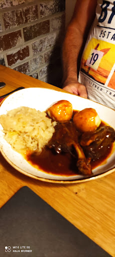 From the start, service was absolutely horrible. No smiles, no welcome no nothing.. we were a group of eight, most of us not Germans, so ordering food doesn’t just happen straight away, as we need to understand the menu and maybe have a few words translated. One would think this to be ok, especially considering we were pretty much the only people in the restaurant on a Wednesday evening.. The waitress was almost just throwing the menu card at us, and it really felt like she had no patience for us to figure out what we wanted to drink or eat… she could clearly tell we were struggling trying to figure out what kind of beer was available, but instead of helping us, she was just standing completely still and rolling her eyes. We felt really unwelcome throughout the evening. Food and drinks were served without smiles, never a “thank you” or any other pleasantries which one would expect. And that’s just my experience on the service.. The food was horrible! I went for the bbq ribs, with red cabbage and fries. Germany is maybe not known for its kitchen or culinary art, but the only effort put into this meal was opening the cans and heating the store bought fries, cabbage, ribs and the most horrible bbq sauce. Just look at the picture..