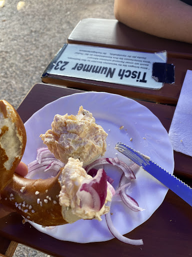 Ein sehr schöner Biergarten (mit kleinen Abstrichen). Zuerst das Positive: Bei schönem Wetter ist es hier unglaublich toll. Das Hygienekonzept ist ausgereift, da man sowohl per QR Code, als auch per Zettel seine Kontaktdaten angeben kann. Kein Gast sieht hier die Daten anderer Gäste! Das Personal ist sehr freundlich und prüft auch, ob alle Gäste ihre Kontaktdaten angegeben haben. Die Tische werden zügig gesäubert, nachdem sie wieder frei wurden. Die Getränkeauswahl ist reichhaltig und die Preise sind voll in Ordnung. Was das Essen betrifft, kann ich die Obatzter Breze gar nicht genug lobpreisen. So unglaublich lecker. Als Snack zum Bier, an heißen Tagen, sehr zu empfehlen. Es gibt einen schönen Spielplatz und im Eingangsbereich können Ziegen gefüttert werden. Manchmal springen sie aus ihrem Gehege, was durchaus für Verwunderung sorgen kann, so nah bei Parkplatz und Straße, aber sie hüpfen irgendwann auch wieder von alleine zurück. Das war echt witzig. Was uns nicht so gut gefallen hatte, waren die Hauptspeisen, die eher Schnellimbiss Charakter hatten, wobei wir weder zur Grillstation, noch zur Ochsenbraterei etwas sagen können, da nicht geöffnet, bzw. nicht von uns ausprobiert. Als unglaubliche Frechheit und absolutes No go empfanden wir das Verhalten der Musiker, die, nachdem wir als einzigen freien Platz an einem heißen Tag das kleine Pavillon ausgesucht hatten, uns sagten, dass dies der Platz der Kapelle sei und wir jetzt noch acht Minuten Zeit hätten, den Platz zu räumen. Extrem arrogantes Verhalten. Es standen keine „Reserviert ab“-Hinweise an diesem Platz. Was dann musikalisch dargeboten wurde, nachdem wir so entgegenkommend waren und ihnen den Platz freigemacht hatten, weil zufällig doch noch ein anderer Tisch frei wurde, war äußerst fragwürdig. Für diese künstlerische „Leistung“ hätten wir rückblickend den Tisch besser nicht freigeben sollen. Davon aber mal abgesehen, ist dieser Biergarten ein echter Tipp und wir waren bestimmt nicht zum...