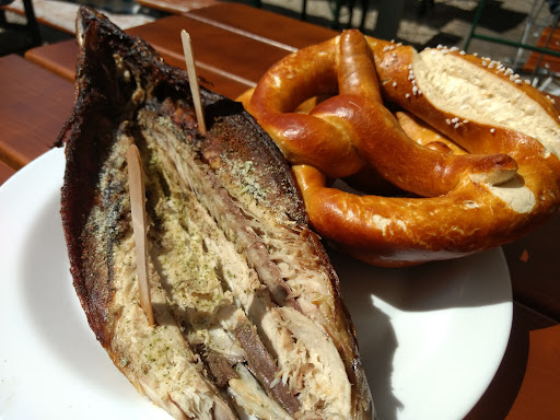 Der Steckerlfisch (an Sonn- und Feiertagen) sucht seines gleichen, die Brezen (wenn auch nur "Normalgröße") sind immer frisch, die Currywurst mit Pommes ist absolut dem Preis angemessen und nicht schlechter als anderswo, der Ochsenbraten vom Spieß ist ein Gedicht und zur Nachspeise sollte man unbedingt die Kiachl (wie bei Oma!) und den Eiskaffee (guter Kaffee, viel Eis) probieren. Ich habe in vielen anderen Biergärten schon schlechteres Essen vorgesetzt bekommen und heute war der Fuchsgarten gesteckt voll und das Essen hat nicht darunter gelitten!
