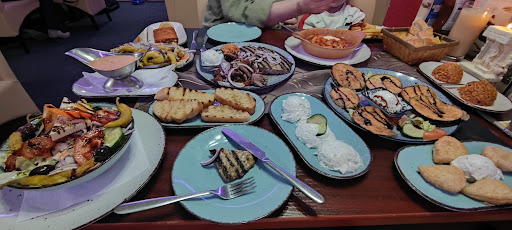 Das Essen war heute nicht so toll wie sonst. Die Vorspeise: Eine gemischete Platte aus warmen Vorspeisen. Ich habe bekommen einen Teller mit frittierten Aubergienen und Zuchini, kaltem Feta, kaltes Weinblatt mit Reis und kaltem Zaziki und kaltes Brot. ausserdem ne menge kalter Salat.