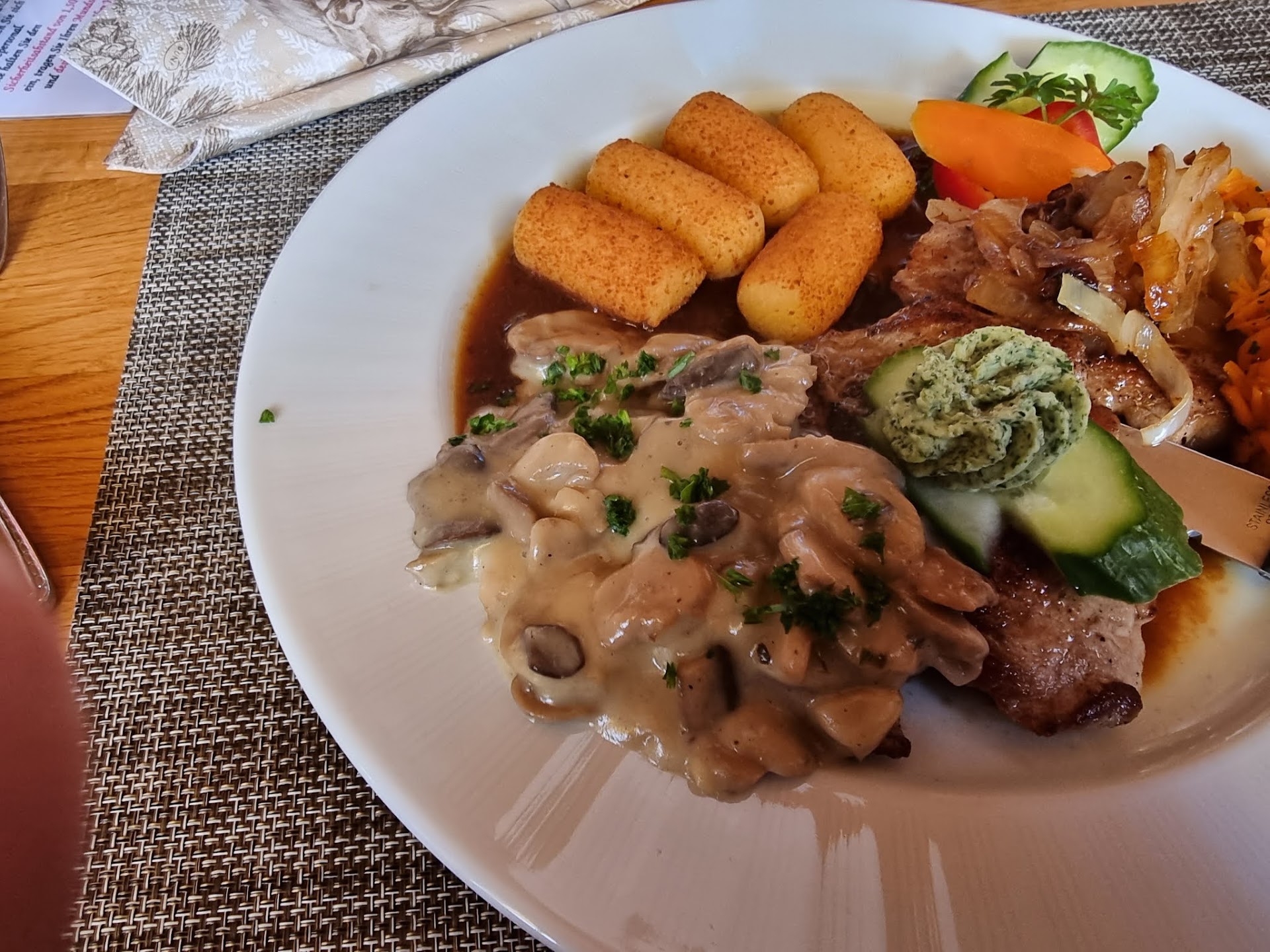 This is an absolutely fantastic place to eat and fully deserving of 5* A variety of traditional German main courses - Roulade, Gulasch, Sauerbraten with something for everyone. All staff were very friendly and helpful. We booked in advance and had a lovely table with a gorgeous view over the valley. Good to see local people having a meal out and a beer here too. Can thoroughly recommend heading up to Garnbach for...