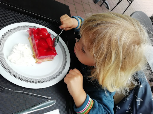 Read moreDie Torte unf der Latte Macchiato schmeckten. Leider musste man erfragen, was es für Torten sind, die in der Auslage standen. Eine Beschriftung würde helfen! Die junge weibliche Bedienung war nicht besonders freundlich. Danke und bitte, sowie guten Appetit ist wohl nicht mehr modern. Später wollte ich noch ein Kaltgetränk. Angeboten wurde auf einem Schild Orangensaft mit Eis. Es gab aber keinen O-Saft mehr (ca.gegen 15 Uhr), so dass ich um 2 Wasser bat. Kurze Antwort, das müsse ich mir aus dem Kühlschrank holen. Wir sassen in einer eigentlich gemütlichen Ecke mit Sofa und Sessel. Leider waren die dort liegenden Kissen sehr fleckig und verschmutzt. Auch der Fußboden im.ganzen Sitzbereich sowie die Tische waren verschmutzt. Gegen 16.30 fing eine Mitarbeiterin an, die Tische abzuwischen und den Fußboden zu fegen. Stühle und Tische wurden hin und her gerückt und geschoben. Dass meine Freundin und ich dort noch sassen, hat sie nicht interessiert und es wurde auch nicht ein Wort der Entschuldigung verloren. Wir sind dann fluchtartig aufgestanden und haben den Laden verlassen, da wir uns rausgefegt fühlten. Ich habe dann gesehen, dass die Tische eingedeckt wurden. Da hätten ein paar nette Worte der Erklärung geholfen und dann wären wir sicherlich auch aufgestanden und hätten uns nicht so unwillkommen gefühlt! So schnell werden wir dort nicht...