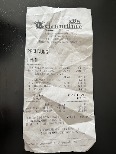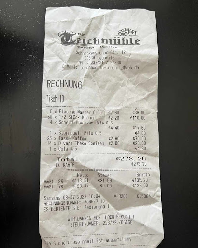 Read moreIch schließe mich hier gleich einmal meinem Vorgänger an. Nach einer wundervollen Trauung im Schloss Leubnitz, zu welcher wir als Gäste geladen waren, kehrten wir in der Teichmühle ein, um das Erlebte bei Kaffee und Kuchen Revue passieren zu lassen. Wir (11 Erwachsene, 2 Kleinkinder und 1 Baby) wurden freundlich empfangen und zu dem reservierten Tisch geleitetet. Er war bereits eingedeckt, aber mit dem Wissen, dass ein Brautpaar zu Gast ist, hätte ruhig ein wenig mehr Liebe zum Detail sein können. Es standen schon Wasserflaschen auf dem Tisch, was uns sehr entgegen kam, bei Außentemperaturen von ca . 30 Grad. Der bestellte Kuchen, wurde serviert und der Kaffee in Thermoskannen auf den Tisch gestellt. Die Lieferung der 5 Bier für die Herren war auch keine Herausforderung. Alles in allem waren wir, so denke ich zumindest, keine stressigen Gäste. Wir ließen uns den Kuchen mitsamt Kaffee schmecken und beschlossen dann, so wie es der Bedienung schon bei Reservierung besprochen wurde, das Restaurant zu verlassen. Die Rechnung war schnell gestellt und bezahlt. Der Kuchen wurde noch verpackt und wir warteten draußen im Schatten, bis dies erledigt ist, um ihn dann abzuholen und ein Trinkgeld zu hinterlassen. Unserer Bedienung ging dies wohl nicht schnell genug, so dass sie den Kuchen raus brachte, mit bösem Gesicht und mit den Worten, Zitat:" über ein Trinkgeld hätten wir uns gefreut, wir sind Ihnen auch entgegengekommen." Dieser Satz fiel im Beisein anderer Biergartenbesucher . Ich war schockiert. So etwas geht gar nicht. Ich finde es eine absolute Frechheit in dieser Art nach Trinkgeld zu betteln. Hinzuzufügen ist, dass sich das "Entgegenkommen" darauf bezog, dass 2,00 Euro statt 4,00 Euro für die Benutzung von Tellern bezahlt werden mussten. Sorry, aber ist das jetzt Miete für benutzte Teller??? Fällt unter den Posten Divers auf der Rechnung. Alles in allem hat diese Aktion unsere Laune erst einmal in den Keller rutschen lassen. Wir werden das Lokal mit Sicherheit kein zweites Mal aufsuchen. P.S. Ein kleines Trinkgeld, welches sicher anders ausgefallen wäre, haben wir trotzdem da gelassen, obwohl wir stark am überlegen waren ob...