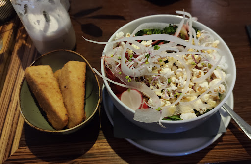 Read moreZugegebener Maßen waren wir dort zur Stoßzeit essen. Optisch macht der Laden schon was her. Und auch der Service war nett. Es war ein völliges Durcheinander und die Servicemitarbeiter/innen wuselten ständig hin und her. Das wirkte oft etwas unkoordiniert und ist leider störend. Wir haben 2 Schorlen, 2 Cocktails und 2 Hauptmalzeiten gleichzeitig bestellt. Es dauerte eine Ewigkeit, aber wir warteten geduldig. Irgendwann kam dann das Essen noch bevor wir ein Getränk am Tisch hatten. Das hatte ich noch nie erlebt. Wir erwähnten dann, dass wir Durst haben. Es verwunderte niemanden, dass wir noch nichts zum Trinken hatten. Dann kam ein Mitarbeiter mit einer Flasche Wasser und wirkte leicht verwirrt. Nachdem wir mitteilten, dass wir was anderes bestellt hätten, ist er wieder abgezogen. Vorher erkundigte er sich noch an den Nachbartischen, ob dort jemand Wasser bestellt habe. Dem war nicht so. Irgendwann kam er wieder und brachte uns das Wasser auf Kosten des Hauses. Danke dafür. Wir konnten endlich was trinken, denn die anderen Getränke ließen weiterhin auf sich warten. Im Verlauf des Abends hatten wir einen weiteren Cocktail bestellt. Da das Lokal bereits recht leer war, dachten wir, das kann ja jetzt nicht mehr so lange dauern. Da hatten wir uns geirrt. Wir warteten wieder eine halbe Ewigkeit.