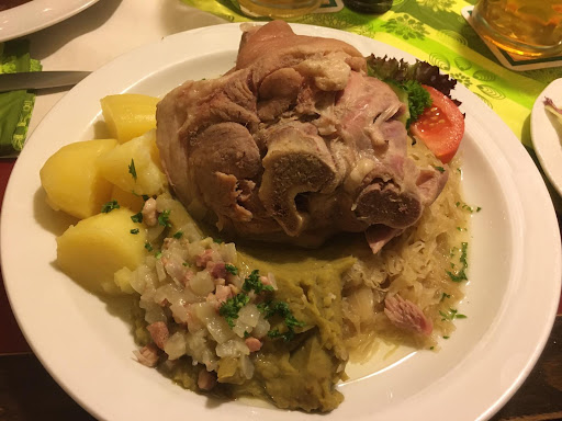 Innen ... ein kleines, rustikales Restaurant. Es war voll, fast alle Plätze waren besetzt. Die Gäste waren im Alter gemischt, von Senioren bis hin zum Baby Mich hat die Atmosphäre dort sehr überrascht, das findet man heute in Deutschland kaum noch. Alles wirkte sehr familiär, ausgesprochen gemütlich. Alle unterhielten sich entspannt, auch an dem kurzzeitig weinenden Baby störte sich niemand, wie in einer ... Großfamilie. Ich warf einen Blick auf die Speisekarte. Zwischen deftig bis kulinarisch kann man sein Gericht wählen. Ich wählte mein Eisbein und war sehr zufrieden. Im Anschluss bestellte ich noch eine Trinkschokolade mit Schlagsahne. Auch das mache ich sonst nie. Auch hierbei würde ich überrascht, die Schlagsahne wurde frisch geschlagen, kam nicht - wie leider sehr oft - aus der Sprühflasche.