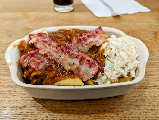 Heute habe ich es nochmal versucht und Poutine Québec bestellt. 9 € kostet die Portion. Angesichts der Tatsache, dass es sich bei der Hauptzutat um labbrige TK-Pommes handelt und die Portion sehr überschaubar ausfällt, halte ich den Preis für zu hoch. Getoppt waren die Pommes mit Chili con Carne, das leider ziemlich fad geschmeckt hat, Sour Cream, gerade mal 4 Scheiben Jalapeños, die zudem leider sehr abgestanden geschmeckt haben und verfärbt gewesen sind und Coleslaw. Ich war die einzige Person, die eine Bestellung getätigt hat und trotzdem hat es länger gedauert als nötig, weil der sehr kühl und wenig motiviert auftretende männliche Mitarbeiter die Zubereitung mehrmals unterbrochen hat, um Privatgespräche mit anderen Mitarbeitern zu führen, was sich in meinen Augen einfach nicht gehört, wenn man im Service-Bereich arbeitet, da es unprofessionell wirkt, man grundlos länger warten muss und man als Kunde nicht das Gefühl hat, willkommen zu sein.