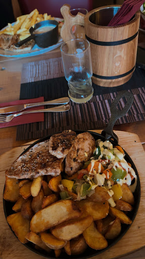 Beim Essen selbst setzte sich der Frust fort: Die Soße Hollandaise war quasi nicht vorhanden – bestenfalls ein paar Tropfen darüber geträufelt. Geschmacklich erinnerte das Gericht stark an Aldi Minutensteaks mit Maggi Fertigmischung für die Pilzrahmsoße. Ein bestelltes Gericht war recht zäh mit Sehne im Fleisch. Das Steak für den Burger war Medium Rare gebraten. Gefragt wie es gewünscht ist wurde davor nicht. Generell auch alles sehr Fad. Vier Gerichte würden zeitlich deutlich vor dem Rest serviert. Diese waren nahezu aufgegessen bis alle weiteren Ihre Bestellungen erhielten. Da hilft auch das rustikale Ambiente nichts.