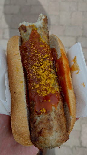 Die vermeintliche Riesencurrywurst entpuppte sich als normale Bratwurst ohne Darm, das auftragen der Sauce auf Brötchen und Wurst sah auch sehr abenteuerlich aus mit einem normalen Esslöffel.