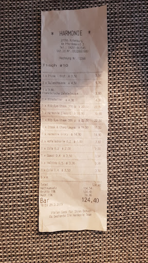Read moreIch war heute in Harmonie und ich muss wirklich sagen das Essen ist nicht gut , ich kann’s keinen empfehlen wenn lieber zu Burgerking und da weiß man was man bekommt und den Preis den man bei Burgerking zahlt ist wenigstens berechtigt… Ich hatte eine Champions Pfanne mit Kroketten , meine Freunde hatten beide chicken Wings mit countrypotatoes und einmal mit Pommes….. Die Soße war flüssig wie Wasser , nichtmal cremig man hat direkt gemerkt das es eine fertig Mischung war mit heißem Wasser zusammen gemischt…. Die Pommes waren papig nicht mal gewürzt und die Countrypotatoes waren 0815 genau so wie die Chicken Wings , die schmecken sogar vom Discounter leckerer… Die Bedienung war sehr nett und höflich und der Lava cake war auch lecker aber der Rest ging garnicht …. Damals als ich da war hatte ich es besser in Erinnerung aber es hat sich in negative verändert… Am Ende haben wir fast 50 € bezahlt und das Essen war einfach nur fertig Tüten Zeug ( so hat es geschmeckt)