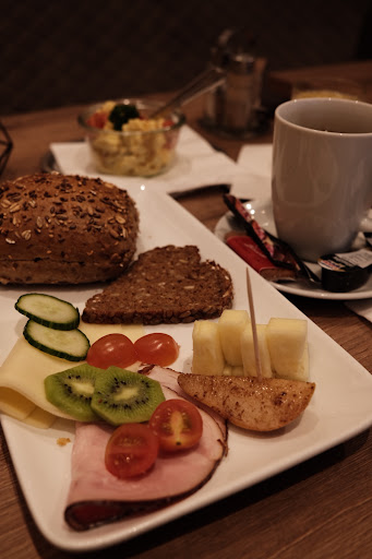 Frühstück: 2 halbe Brötchen, Rührei, ein zusätzliches Brötchen (weil beim Rührei keines dabei), zweite Tasse Kaffee: fast 18 Euro bezahlt. Das ist zu teuer! (Siehe Foto). Wartezeit sehr lang (1 Punkt), Bedienung aber sehr freundlich (5 Punkte). (Schicht wohl unterbesetzt). Brötchen etwas lieblos, mehr Butter als Nutella, Salatstückchen unter Käse sah nicht lecker aus (Essig und Öl suppte ins Brötchen), Serviette um Besteck abgefranzt und Fleck drauf,...