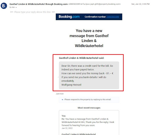 I am sharing my experience with my stay with Gasthof Linden & Wildkräuterhotel on 25 Dec - 26 Dec 2021. The stay was pleasant, however the integrity of the hotel owner and staff has left me deeply disappointed. I have paid for the hotel stay via the Booking.com platform using my Credit Card, however hotel Gasthof Linden & Wildkräuterhotel demanded another payment for the hotel during our checkout, noticing that the initial payment might be unsuccessful, we paid for the hotel during our checkout. It is only upon receiving my Credit Statement, that I found out that was billed twice. Subsequently, I reached out to the Gasthof Linden & Wildkräuterhotel on booking.com, it took a while to sort this out, on 22 Jan 2022, the staff finally got back to me that there is indeed a double payment made for the hotel stay (attached picture for reference), however since exchanging a few messages we have not heard from Gasthof Linden & Wildkräuterhotel and till date after providing my bank details, I have not received any refund for the double payment. I hope this will help and serve as a service announcement for anyone keen to stay with Gasthof Linden & Wildkräuterhotel. DO NOT TRUST THE STAFF OF THIS ESTABLISHMENT.