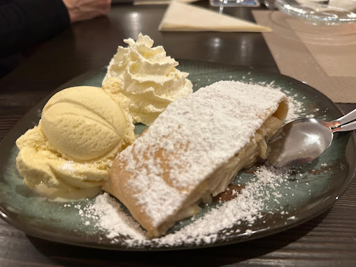 The apple struedel with ice cream and whipped cream was absolutely delicious and divine - not too sweet or tarty!