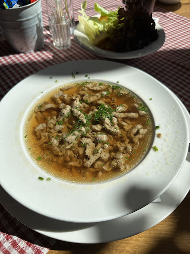 Meine Rezension bezieht sich heute jedoch primär auf den Besuch in der Metzgerei nebenan: ich nahm eine Leberkassemmi, und wollte einen Kaffee zum Mitnehmen dazu. Nachdem ich die Frage der sehr freundlichen Thekenkraft bejahte, daß ich die Semmel sofort verzehre und sie diese nicht extra verpacken muß, schlug sie mir vor, daß ich meine Semmel im Biergarten in der Sonne essen darf, ohne Aufpreis zur Karte - weil das Wetter so schön ist! Ich bekam dann einen Teller und den Kaffee in der Tasse. Der Kollegin im Restaurant wurde Bescheid gesagt. So etwas ist nicht selbstverständlich, auch wenn es halb 10 vormittags war und der Biergarten natürlich noch leer! Hier ist der Kunde wirklich noch König. Ich habe mich sehr wohlgefühlt, und deshalb gleich numoj a Leberkassemmi kaaft (kostet übrigens nur 2€, mit Senf 2,20€ -,auch das ist nahezu konkurrenzlos)!