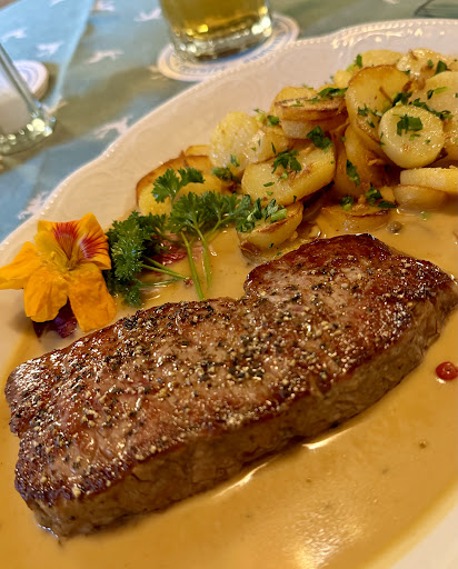 Wir bestellten erst eine Runde Getränke, Kaffee und Bier gemischt in der Gruppe. Ein Blick in die Speisekarte löste dann doch bei einigen ein leichtes Hungergefühl aus und man bestellte noch Schnitzel mit Röstkartoffel, Rinderbrühe mit Leberknödel und (typisch bayerisch) Leberkäse mit hausgemachtem Kartoffelsalat. Alles kam auch relativ zügig an und sah wirklich toll aus. Die Röstkartoffel hätten noch etwas länger in der Pfanne und etwas Salz vertragen, aber dies ist immer Geschmackssache und keine Kritik. Jeder von uns war mit dem Essen sehr zufrieden und so bestellte man noch etwas Süßes hinterher. Auch die Nachspeise war sehr liebevoll und schön angerichtet.