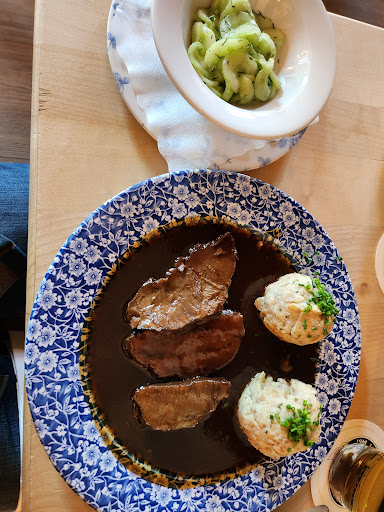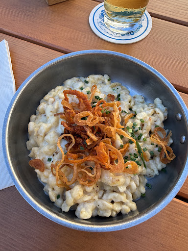 Zum Essen: wir hatte unteranderem die Käsespätzle. Als der Teller kam, waren wir kurz irritiert – die Portion wirkte recht überschaubar, fast wie eine Kinderportion. Zwar war etwas Garnitur auf dem Teller, aber ein Beilagensalat, den man bei diesem Gericht klassischerweise erwartet, fehlte komplett. Sehr kleine Portion. Geschmacklich: Die Käsespätzle hatten einen deutlichen Ton von brauner Butter – dieser nussig-karamellige Geschmack, der entsteht, wenn Butter zur beurre noisette gezogen wird. Muss man mögen, ich persönlich erkenne darin solides Handwerk. Allerdings war die Aromatik so dominant, dass der Käse – vermutlich ein milder Allgäuer oder Emmentaler – kaum Profil entwickeln konnte. Die Textur der Spätzle war in Ordnung. Im Nachhinein habe ich mir Bewertungen zum Schweinebraten durchgelesen – und war dann doch ganz froh, dass ich bei den „Kinderkäsespätzle“...