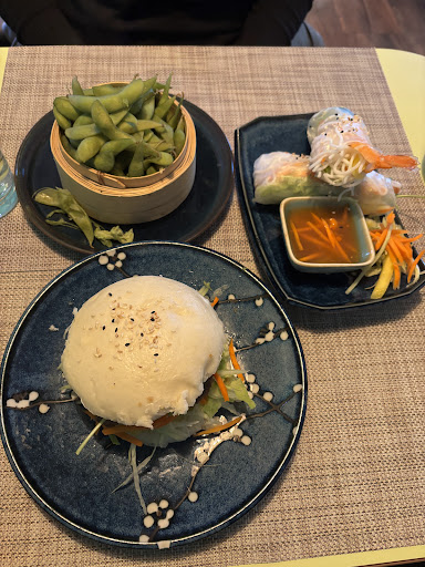 Zum Essen: • Die Summer Rolls waren solide – frisch, gut gewickelt, geschmacklich in Ordnung. Der Fischsaucen-Dip passte gut dazu. • Die gedämpften Bohnen waren ebenfalls gut, aber lieblos angerichtet. • Die Baozi mit Rindfleisch überzeugten geschmacklich – saftig, aromatisch, schön abgestimmt. • Die Ente mit Saisongemüse und Mango-Sauce dagegen war eine Enttäuschung: kaum Fleisch, stattdessen viel Panade und Fett. Die Sauce schmeckte pappsüß wie ein Fertigprodukt, und vom „Saisongemüse“ war kaum etwas zu sehen – ein Viertel Brokkoliröschen, etwas Salat, Karottenraspeln und ein paar Mangostreifen. Im Prinzip dieselben Zutaten wie bei den Baozi und den Sommerrollen. Der Reis dazu war immerhin wirklich gut. • Die Lachs Crunchy Rolls wiederum waren sehr lecker und eines der Highlights des Abends.