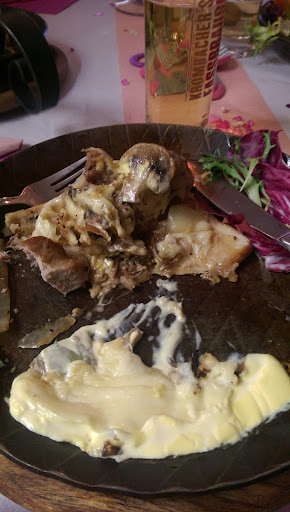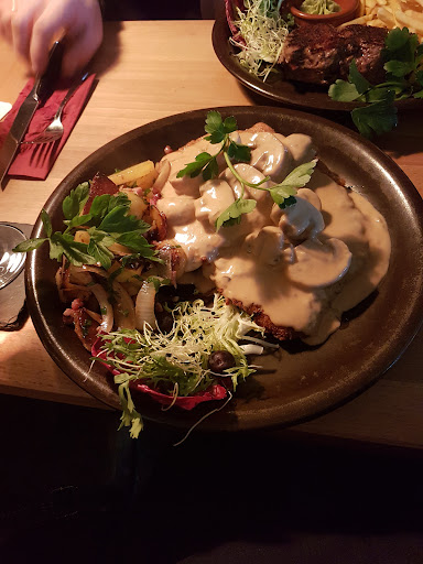 Wir wussten, dass die Portionen schon etwas größer sind. Zwiebelsuppe zur Vorspeise, mit Käse überbacken, noch nie gesehen. Super! Danach war ich eigentlich satt, soviel zur Größe der Portion. Dann Jägerschnitzel Pommes mit Beilagensalat. WAHNSINN, dicke, selbst gemachte Pommes, 2 schnitzel von super Qualität und jägersauce wie ich sie noch nie gesehen habe. Dicke, frische Champions, mittig geteilt mit Rahmsauce, da war ich echt begeistert von. Der Beilagensalat war so groß, dass er locker als einzelne Portion, als Hauptgang durchgehen würde. Grüner Salat mit leckerer sauce, wo zum Teil Erdbeeren, Himbeeren, Melone und Kiwi drin war. Kannte ich so auch noch nicht. War außergewöhnlich aber auch richtig gut. Musste ich aber leider halb zurück geben weil nix mehr rein gepasst hat. Natürlich, Nachtisch geht immer! Crunchy Caramel Becher, Top!