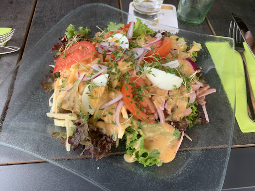 Read moreDas Äußere dieses Lokals ist nicht so ganz mein Geschmack, aber bei einem Restaurant ist der Geschmack ja auch eher in einem anderen Zusammenhang zu sehen. Die Terrasse liegt teilweise unter dem Niveau der dicht vorbeiführenden Straße. Je nachdem welchen Platz man ergattert, hat man die Nase auf Auspuffhöhe der dicht vorbei fahrenden Fahrzeuge. Aufgepasst bei der Sitzplatzwahl! Vielleicht ist es doch besser innen zu sitzen. Zu Essen wählte ich "Pfefferschnitzel mit Pommes Frittes, Salat" klassisch deutsches mittleres Preissegment, hier eher zum günstigen Preis. Ich will nicht groß um den Brei herum reden: Das war prima! Die Soße nicht pappig angedickt und auch nicht so viel, dass im Teller alles schwimmt, mit verschiedenen Kräutern und grünem Pfeffer angerichtet - geschmacklich eine Freude. Und die Pommes - in frischem Öl knusprig frittiert und auch die Farbe wie gemalt. Die Salatsoße vielleicht etwas zu steif (evt. Fertigsoße? -hm-). Über Möhren- und Sellerieraspel aus dem Glas sehe...