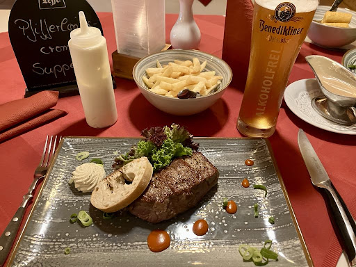 Als ich nach einer mehrstündigen Autofahrt inklusive Verkehrsbehinderungen in Hermannsburg ankam, hatte ich großen Hunger, und da meine Kameradin auch Steak bestellen wollte, kam nichts anderes als ein Steak in Frage. Ich entschied mich für ein Rumpsteak vom argentinischen Angus-Rind, meine Kameradin bestellte sich ein "Rumpsteak "Basilikata"- 180 g Rumpsteak mit italienischen Kräutern, frischen, gebratenen Champignons, Schinkenwürfeln und Zwiebeln" und als Vorspeise Kugelbrot mit Kräuterbutter. Ich war von meinem Steak absolut begeistert, richtig zart und saftig, so muss ein Steak sein! Es war ein sehr schöner Aufenthalt mit leckerem Essen und interessanten Gesprächen, wir saßen wegen des guten Wetters im Außenbereich. Meine Absicht war zunächst meine Kameradin einzuladen, aber wir einigten uns darauf uns die Rechnung zu teilen, inklusive Trinkgeld zahlten wir 80 € (meine Kameradin 30 €, ich 50 €).