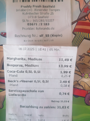 Read moreWollte mir eine Pizza und zwei Stücke Schokokuchen bestellen und habe 3 Nugathörnchen bekommen. Habe keine Ahnung, warum im Warenkorb was anderes war, als ich angeklickt hab. Die Mitarbeiterin war nicht besonders freundlich und hat nur ("Sie haben an dem Computer wahrscheinlich auf eine falsche Taste gedrückt"). Man hätte immerhin mal überlegen können, dass auch das Bestellprogramm mal einen Hänger haben kann. Egal wie, ich hätte selber besser kontrollieren müssen - komisch ist es trotzdem. Bestellen werde ich so schnell jedenfalls nix mehr. Freddy fresh habe ich eh nur bestellt, wenn ich nicht mehr aus dem Haus wollte. Die Gründe: Pizza nicht sonderlich knusprig, viel zu viel Tomatensose, zu wenig Käse und alle, die kein Hähnchen auf ihre Pizza wollen, ist die Auswahl ohnehin sehr klein. Für den Preis kann ich auch in eine Pizzeria gehen und habe was...