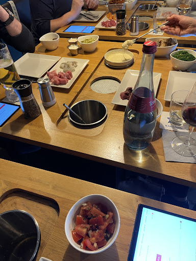 Jetzt zum Abend: Dort angekommen wurden wir begrüßt und haben unseren Tisch zugewiesen bekommen. Wir sind dann zum Tisch, da aber noch 3 von 6 Personen von uns gefehlt hatten, wollte der Herr zum Erklären des Systems nochmal kommen, wenn alle da sind. Auf die Erklärung warten wir immer noch - wir haben dann, nachdem nach etwa 20 Minuten die Getränke aufgenommen wurden - auf eigene Faust das Tablett ausprobiert und auf gut Glück bestellt. Dann kam der Herr nochmal und meinte „wie ich sehe, seid ihr klargekommen, bestellt nur nicht zu viel für den Anfang, ihr könnt immer wieder nachbestellen.“ Inzwischen saßen wir dort 76 Minuten, vor über einer halben Stunde kam der Topf mit dem Öl, der so vor sich hinbrödelt… Fleisch oder Beilagen haben wir noch keine.